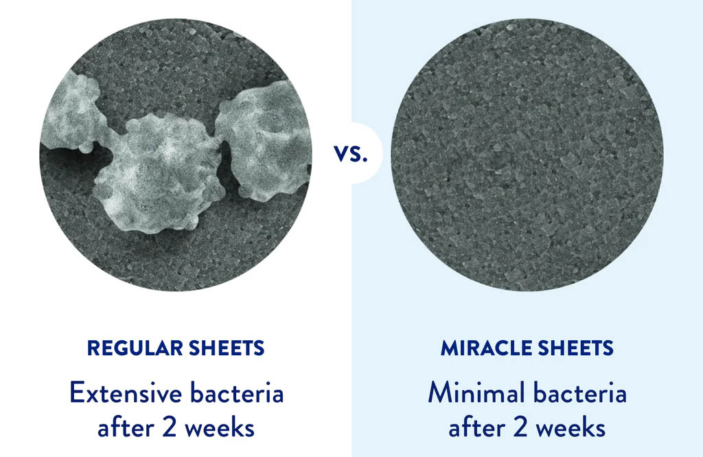 We learned that sheets that haven’t been washed in a week have 3 million particles of bacteria per square inch (that’s more than a toilet seat). This fact helped inspire Miracle Sheets creators to make sure their sheets were bacteria-killing.
